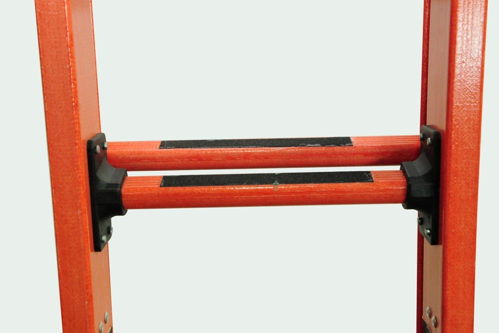 Os degraus são em formato tipo 'D' tendo suas extremidades prensadas através de cartolas em nylon no montante.
